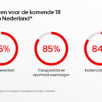Verder blijft cloud hoog op de IT‑agenda staan. Obstakels die Nederlandse organisaties moeten overwinnen in hun cloud-strategie zijn onder meer onduidelijkheid over ROI (77%²), gebrek aan vaardigheden (74%²), zorgen over soevereiniteit (71%²) en medewerkers die weerstand bieden tegen verandering (70%²). Kijken we naar de strategie voor cloudsoevereiniteit in de komende 18 maanden, dan prioriteren Nederlandse respondenten flexibiliteit en keuzevrijheid in IT‑leveranciers (88%2), naleving van regelgeving (86%2) en het beveiligen van de softwaretoeleveringsketen (85%2).